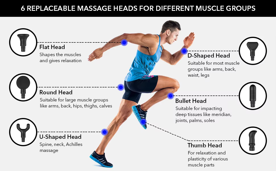 Multi-head Design: Comes with 8 interchangeable massage heads for versatile muscle treatment